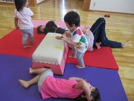 朝のおやつを食べて元気いっぱいになった子どもたち。ギャラリーに行って走ったり、よじ登ったり、跳んだりして、たくさん身体を動かして遊びました。保育者がおばけや鬼になって追いかけると、「きゃーーー!!」と大笑いしながら走って逃げていました。たくさん走った後は、マットの上にごろ~んと寝転がって休憩しましたよ。