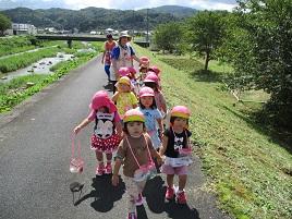 今日は穏やかな良いお天気だったので、ロイヤルホテル方面の河川敷までお散歩しました。散歩の途中で小学一年生のお兄さんたちがマラソンをしていて、手を振ってくれました。何人か兄弟もいて、とても嬉しそうでした。河川敷では、バッタやトンボやクモなど様々な虫がいたり、葉っぱの陰にはテントウムシが隠れており、たくさん捕まえることができました。なかなか見つけにくいテントウムシを見つけるたんぽぽ組さんの観察眼には驚きました。皆、お散歩バッグにテントウムシを入れて持ち帰ったり、大きな葉をお面にしたり、団扇にしたり、テントウムシのお家にして楽しみました。