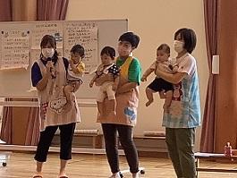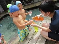 子ども達が作った氷で遊びました。チームごとに豆腐の入れ物に金魚のおもちゃを入れて物とゼリーのカップに水を入れた物を目の前にすると、「凍っとるかな~?」とワクワク♡氷に水をかけると氷が溶け、中から金魚が‼「先生、金魚とれたよ~」と見事ゲットして嬉しそうな子ども達でした。暑い日には、冷たい氷が一番ですね‼
