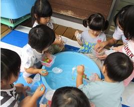 この日は、天候の悪い日が続いていたので久しぶりのプール遊びでした。ペットボトルを使ってジュース屋さんをしたり、水のかけ合いをしたり大はしゃぎでした。今日は、3歳未満児合同でプールだけではなく、スーパーボールすくいやシャボン玉も楽しみました。もも組さん、みかん組さんは「スーパーボールいっぱいとれた!」「大きなシャボン玉できた!」など嬉しそうな子ども達でした。いちご組さんもシャボン玉を見て、指差ししたり、目で追ったりして楽しんでいました。