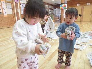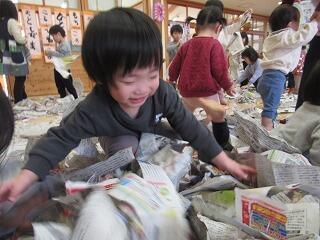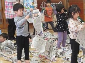 今日はホールで新聞遊びをしました。たくさんの新聞紙を広げてびりびり破っていくと、丸めて投げてみたり、新聞紙を広げて持って走ってみたりして楽しんでいると、ほかのクラスのお友だちも遊びに来てくれました。たくさん新聞紙があるので、一緒に遊ぼうと誘うと、小さい子を見てくれるお兄さん達。一緒に破ったり、破った新聞紙を集めたり、お布団のように新聞紙を掛けたりして思い切り楽しみました。最後はホールいっぱいの新聞紙をみんなできれいに集めました。