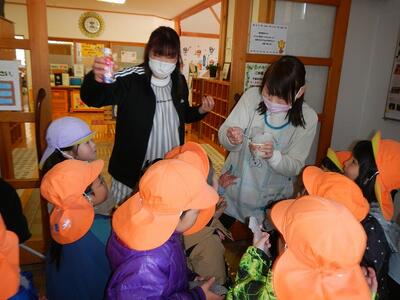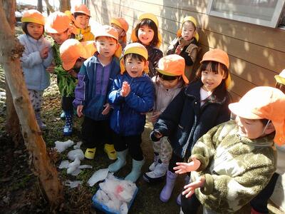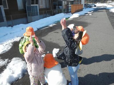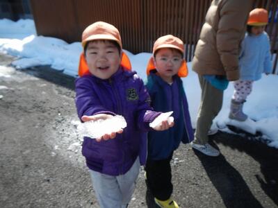 「先生、来るとき、氷でつるつるしとった。」「氷で転びそうになった。」と、朝から氷の話題で盛り上がっていたので、探検隊に変身し、氷を探しに出かけました。川沿いの道で氷を発見し、大喜び。「あったー‼氷だー。」「手に持っとったら、つめたいなー。」と言いながら、しゃがんでこすったり、のぞいたりしなから、次々に氷を見つけていました。「雪が凍っとるけ、雪氷だ。」と雪と氷が混ざったものを見つけたり、「氷を空にむけたらピカピカしとるー。」など、日の光を浴びて輝く氷のきれいさにうっとりしたりしていました。