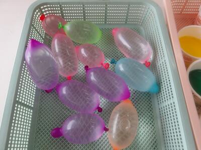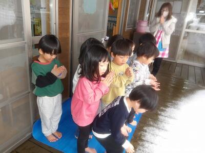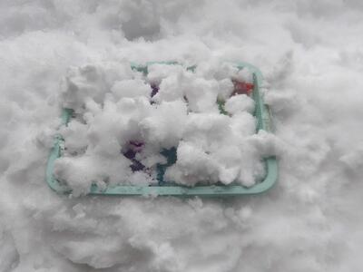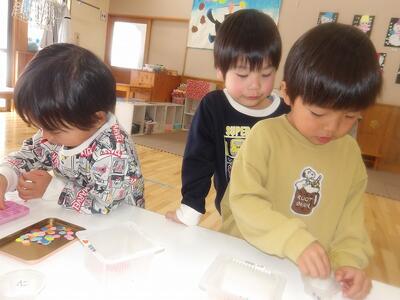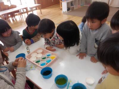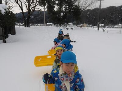 今朝も冷え込んで道路もカチコチ。そうだ、氷を作ってみよう!(笑)ということでカップや水風船で氷作りをしました。色水を入れたカップ、ビーズやキラキラを入れたカップ、水風船と3種類を用意。保育者が水風船に水を入れるところをみて大喜び。触るとプニプニで気持ちいい~と感触を楽しんでいました。ちゃんと凍るにはどうしたらいいかな?と聞いたら「雪の中に隠す!」という答えが返ってきたので、「凍っていますように」とお願いしながら水風船は雪の中に隠しました。さてどうなるかな。その後、園庭に出ました。大人の膝上ほどの雪でしたが、ソリをしたいちゅうりっぷさん。道なき道をクジラ山目指して頑張って歩きましたよ。誰もいない園庭でソリ遊びをたっぷり楽しみました!!