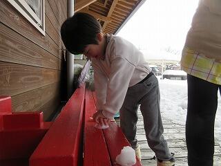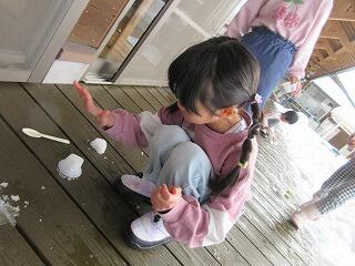 休みで雪が沢山積もり、園庭の中は雪だらけ~。今日は、給食のデザートで食べたプリンのカップを使って氷作りをしてみました。カップに雪を入れて逆さにしても形が上手くできず・・。「スプーンで力いっぱい叩いてみたら固まるかも」、「水を少し入れたら少し固くなるよ」と友達に教えたり、「水を入れてからも15待たんといけんけな」と数を数えて待ったりときれいに作るためにはどうしたらいいのか子ども達なりに研究‼一人ひとりが何個か作って並べていたので形の変化が分かり、「最後のは、一番きれいに出来た~」と嬉しそうでしたよ。