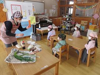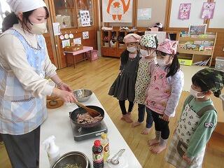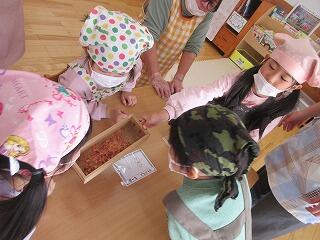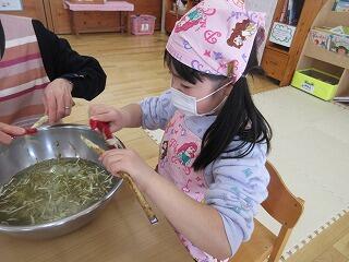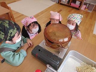 今日は、町の栄養士さんにお世話になり、料理教室をしました。今日のメニューは、すまし汁と炊き込みご飯‼人数も少ないので、切る材料も沢山で大忙しでしたが、お家でも包丁を使ってお手伝いをしている子がいたので、切る作業もとても早く栄養士さんもビックリされていました。そして今回は、鰹節削りにも挑戦‼家では、なかなか体験出来ないので、子ども達も興味津々‼削り終えると「宝箱あけてみよう」と削り器の箱を開けてどれくらい削れているのか皆で確認‼「もう1回したい」「まだまだ少ないけ削りたい」と削ることが楽しい、さくらさんでした。部屋中は、炊き込みご飯とすまし汁のいい匂い♡「早く食べたいな~。」とお腹がぺっこぺこ。「美味しい。これ、私が切った豆腐だ~」と自分たちが作ったご飯に大満足でした。ぜひお家でも一緒にクッキングしてみてくださいね‼