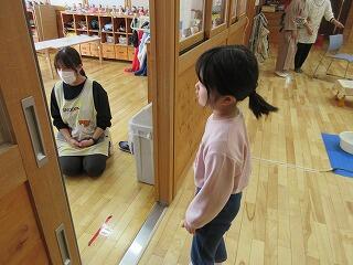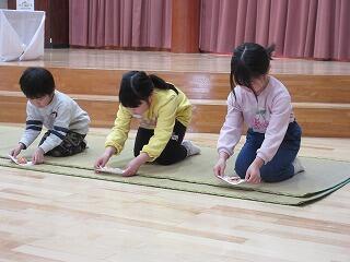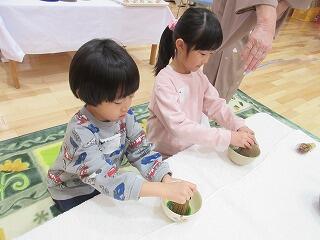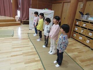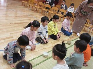 今日は、たんぽぽ組さんを招待してお茶会をしました。「お茶会の準備が出来ました。ホールへどうぞ」と、たんぽぽ組さんに声を掛けてお茶会がスタート‼まずは、お菓子を食べたり、お抹茶をのんだりする所をたんぽぽ組さんに披露しました。たんぽぽ組さんが見る中、大きな声であいさつをするさくら組さん‼素敵なお手本となっていました。たんぽぽ組さんへも上手にお運びしてくれて、かっこいい姿を見せることが出来ました。3月は、いよいよお家の人を招待しての卒園茶会です。今日のようにさくら組さんらしい姿を見せれるといいなと思います。