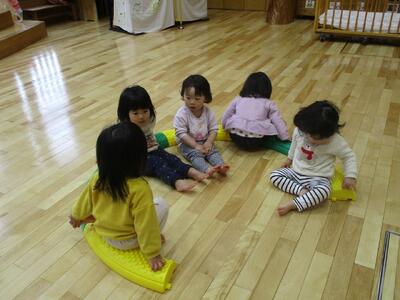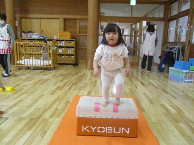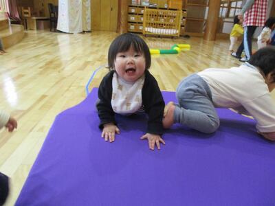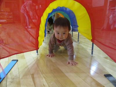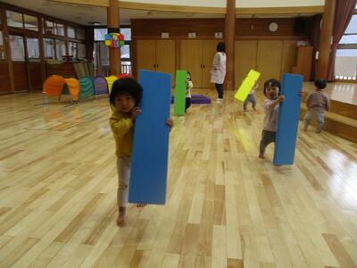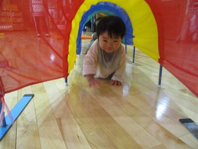 今日は、ホールで跳び箱、マット、トンネル、デコボコブロックなど色々なものを出して遊びました。跳び箱に乗ってジャンプしたり、デコボコブロックの周りに座ってゆったりしたり、トンネルから「ばあ!」と友達と顔を見合わせたり、色々なもので体を動かしてとても楽しそうないちご組さんでした。最後は、片付けも手伝ってくれました!