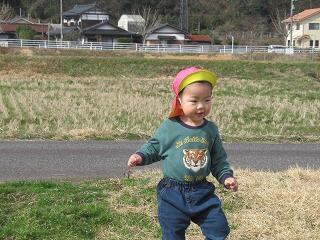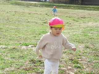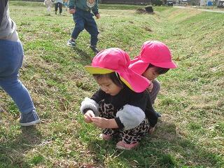 今日は農道までお散歩に出かけました。お日様がぽかぽか気持ちがよく、上着を着なくてもいいくらい暖かかったですが、風が吹くと少し寒かったです。農道をかけっこして楽しんだり、ダンプカーが川の向こう側で走っているのを見て、≪はたらくくるま≫を連想して、みんなが歌ってました。野原に着くと、虫を探したり、花を摘んで自然散策を楽しむ子ども達でした。草むらの中に一輪だけタンポポが咲いており、摘んだ子は嬉しくてみんなに見せたり、大事に園まで持ち帰ってました。