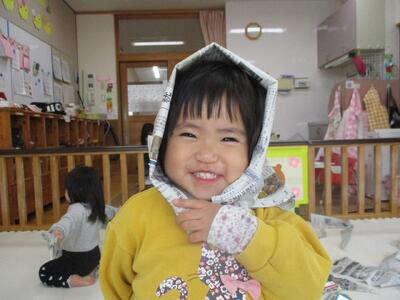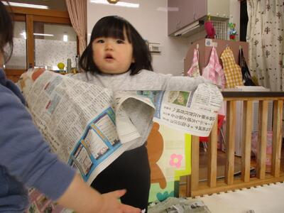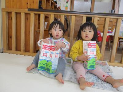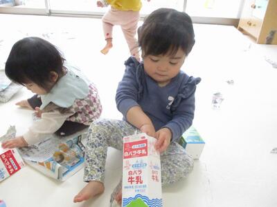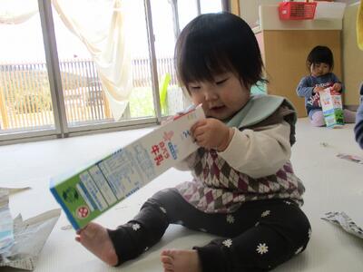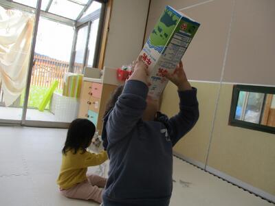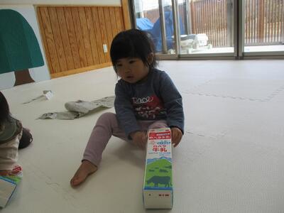 今日は、牛乳パックと新聞紙を出して遊びました。牛乳パックを足に入れたり、飲む真似をしたり、新聞紙を被ったり、詰めたり、色々な遊び方を見つけて嬉しそうにしていました。友達がやっていることに興味を持ち真似をする姿や友達が欲しがっているものを「どうぞ」と自ら渡してあげる姿など関わりの中で成長している面がたくさん見られます。