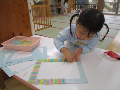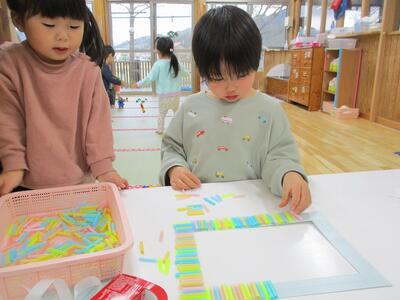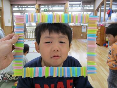 カラフルなストローをペタペタと順序よくくっつけていき、可愛い何かができました♪