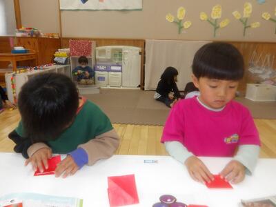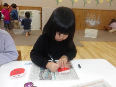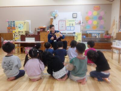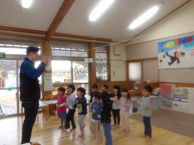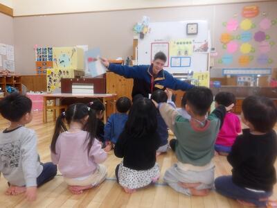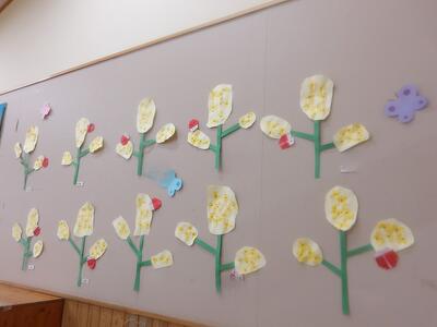 コール先生の英会話教室がありました。絵本の中に出てくる色や数字の英語を教えてもらいました。知っている子もいてブルーだよ、イエローだよと積極的に答えていましたよ。ハローソングとグッバイソングも覚えて大きな声で歌えるようになり、一年間毎月一回の英会話の時間でしたが、しっかり身についているなあと感じました。最後に一年間をお礼をこめて大きな声で「ありがとうございました。」と挨拶できたちゅうりっぷさんです。その後、折り紙でテントウムシを折り、菜の花のお花畑にテントウムシが仲間入りしましたよ🐞