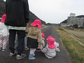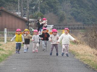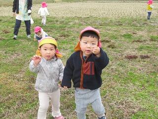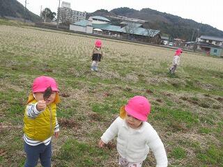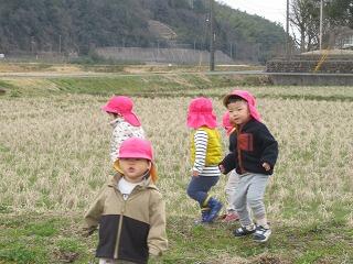 今日は農道までお散歩に出かけました。農道をかけっこをしたり、野原で土筆やきれいなお花を摘んで楽しんだ後、草むらの中から大きな鳥がお食事中でした。ちょっと怖かったので、少し離れてみんなで観察をしました。お食事を終えた鳥さんはどこかへ飛んで行ってしまいました。翼を広げると子ども達より大きな鳥だったので、びっくりしました。