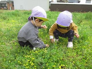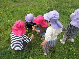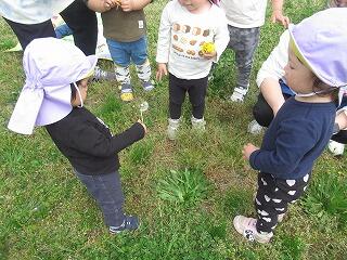 今日も、もも組とみかん組でお散歩に出掛けました。農道をぐるりと一周お散歩した後は、畑で遊びました。畑の中は、広いので走り放題‼子ども達も自由に走ることができるので、とっても楽しそうです。たんぽぽやオオイヌノフグリも咲いていて春のお花を見つけると嬉しそうに保育者に見せてくれる子ども達です。たんぽぽの綿毛も1本発見‼何人かのお友達が「フ~」と吹いてみると、綿毛が風にのってきれいに飛んでいきました~。